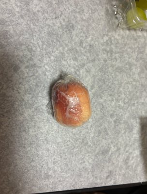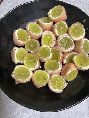 そのうえにシャインマスカットをのせてクルッと丸め、キャンディーのように両端を縛ります。