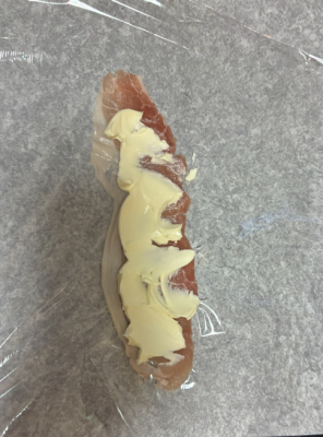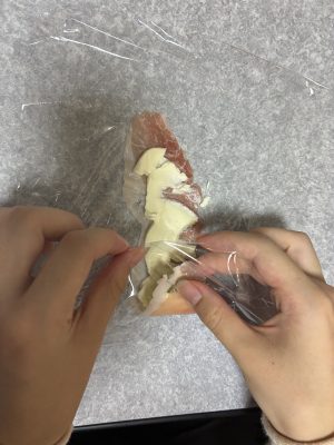 ラップの上に生ハムを並べ、上にクリームチーズを薄くのばします。