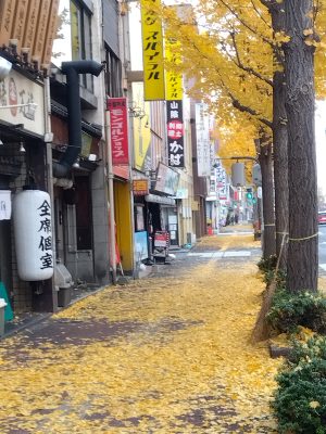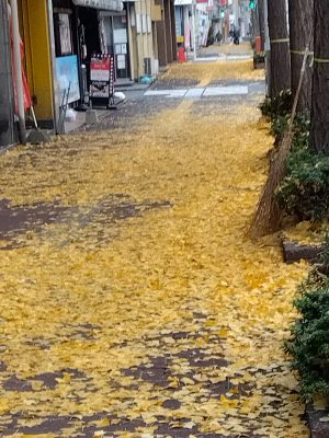 街路樹のイチョウが一斉に色づき、通りはまるで黄色いじゅうたんを敷いたように鮮やかに染まります。
