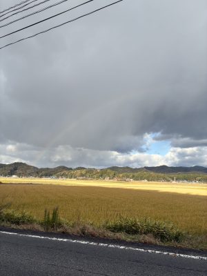 当日は雪の予報で前の週より心配をし、当日も少し雪が舞っていましたが学校に到着すると何と虹が!